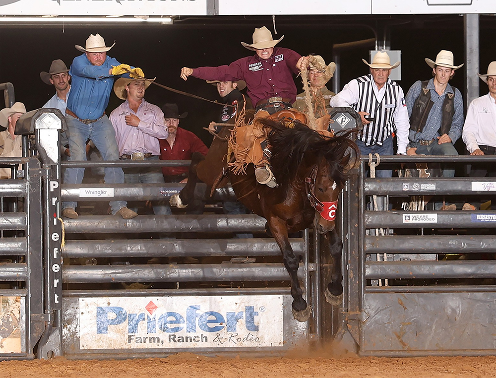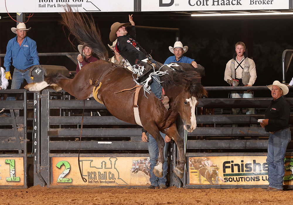 Leighton Berry was sidelined much of the 2025 season but returned to action the end of September. As the 2026 ProRodeo campaign kicked off at the Waller County Fair and Rodeo, Berry had proven he was ready for action with the win. (PHOTO BY PEGGY GANDER) HEMPSTEAD, Texas – Broken bones sometimes lead to broken dreams for competitors. Bareback rider Leighton Berry didn’t let it affect him much the initial shock of a broken riding hand. He actually took advantage of his time out of the arena. Two weeks after the injury, he and wife Kodi welcomed their son, Ledger, on April 28, 2025. That wasn’t all. “I had my hip fixed on June 4,” said Berry, a four-time National Finals Rodeo qualifier from Weatherford, Texas. “I’d been pushing off hip surgery for the last year. I was supposed to have it done after the NFR in ’24, and I thought God was telling me something different. Sure enough, he has a funny way of showing that you probably should do what you’re going to say. “When I realized I was going to be out six to eight weeks with my hand injury and already and hadn’t had a great winter (portion of the season), I went ahead and had my hip fixed. Ever since I came out of the waiting room after my surgery, I’ve just been thinking about coming back a stronger bareback rider.” He returned to action during the last couple weeks of the 2025 regular season, which concluded Sept. 30. He placed in Pasadena, Texas, and shared the victory in Stephenville, Texas, which was the perfect precursor to his 2026 campaign. He just added to it Saturday night with a 90.5-point ride on Pete Carr Pro Rodeo’s Secret’s Out for 90.5 points. “This is pretty much how I pictured starting off my new year,” he said. “I had in my mind that I wanted it to start off with a 90. Back in 2020 before my first NFR, I was 90 points on (Carr’s) Fancy Free at this same rodeo, and it just set up my whole year. “I had a great horse from Pete Carr Pro Rodeo, one that’s probably going to be seen in the TV pen at this year’s National Finals. I made sure to get down here on time, and it sure paid off.” It’ll buy a lot of diapers for that 5-month-old baby boy. “Having a family now really fuels my fire, and I’ve been just thinking about going back to the basics, getting my mental game back where I was craving every bucking horse I got on no matter what rodeo I was at, what (money) as added and what kind of caliber horse is underneath me,” said Berry, who earned $1,951 for winning the Hempstead title. “I just really wanted to focus on going back to being Leighton Berry and enjoy riding bareback horses, because that’s what it’s all about. “Whenever Ledger got here, and I know a lot people say this, but it really does open your eyes and gives you a whole new perspective. I’ve always thought to be a better person with a lot of drive and passion for what I do, but knowing that I’ve got him to raise, give something to look up to and obviously provide for, It really did just light a whole new fire in me.” That passion is continuing to build. His bonding time with Kodi and Ledger was amazing, but he’s been craving the chance to spur bucking horses again. He was in Cheyenne, Wyoming, working for The Cowboy Channel and watched his younger brother, Kade, win the title. A few weeks later, Kade was sidelined on his own with an injury, so both second-generation cowboys are eager for action. “We were supposed to travel together this year, but we’re planning on both being 100 percent healthy by January,” he said. “You’re going to see a lot of the Berry Boys in the same rig in 2026. As humble as we try to be, we sure practice what we preach. We try to work hard and push each other, and nobody wants to win more than me and nobody wants to win more than me. We feed off each other and push ourselves and, at the end of the day, just have fun riding barebacks.” That’s not all Leighton Berry can do, though. He grew up also roping calves and steers, so he and saddle bronc rider Parker Fleet entered the team roping together. While they didn’t have any luck in that event, they were part of the all-around race. “Some of these Texas Circuit rodeos have always given need all-around prizes,” Berry said. “They give an AR-15 rifle for the all-around here, so why not go for it. “I love the way it feels when you win the all-around. To me, it means you’re somewhat the kinf of the rodeo, at least for the moment.” Waller County Fair and Rodeo Oct. 2-4 Hempstead, Texas All-around cowboy: Parker Fleet, $2,267 in saddle bronc riding and team roping. Bareback riding: 1. Leighton Berry, 90.5 points on Pete Carr Pro Rodeo’s Secret’s Out, $1,951; 2. (tie) Matt McLanahan, Andy Gingerich and Bryce Eck, 80.5, $1,106 each; 5. Colton Clemons, 80, $455; 6. (tie) Darien Johnson and Colt Eck, 79, $293 each; 8. Wayne Warneke, 77.5, $195. Steer wrestling: 1. Joseph Guze, 3.4 seconds, $2,189; 2. Gus Franzen, 3.7, $1,932; 3. Wyatt Fields, 3.9, $1,674; 4. Darcy Kersh, 4.0, $1,417; 5. (tie) Tory Johnson and Bryn Roy, 4.1, $1,223; 7. Dakota Champion, 4.2, $1,030; 8. (tie) Emmett Edler, Tucker Ravenscroft and Tyler Ravenscroft, 4.3, $730 each. Team roping: 1. Dustin Egusquiza/JC Flake, 3.8 seconds, $4,594; 2. Brayden Fillmore/Cody Lansing, 4.1, $4,054; 3. Cash Duty/Jake Edwards, 4.3, $3,513; 4. Marcus Theriot/Chase Graves, 4.4, $2,973; 5. Peyton Holliday/Gavin Foster, 4.6, $2,432; 6. (tie) Cyle Denison/Lane Mitchell, Chris Francis/Cade Passig, Brenten Hall/Kaden Profili and Tanner Tomlinson/Travis Graves, 4.7, $1,757 each; 10. (tie) Riley Continue Reading »