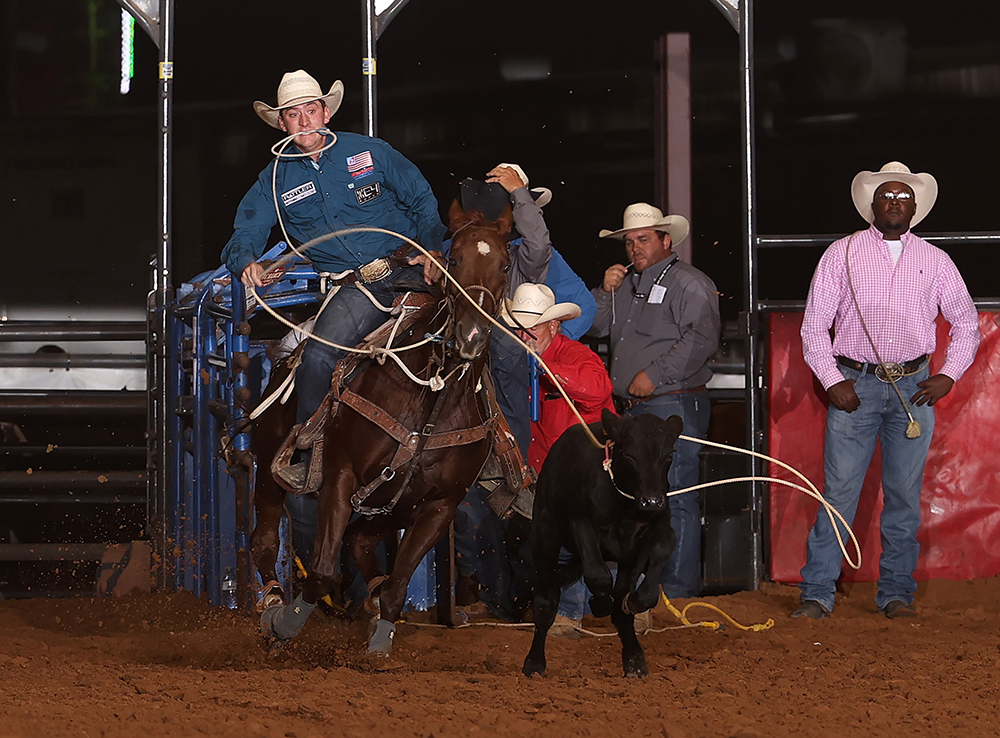 Cutter Carpenter moved into the tie-down roping lead at the Waller County Fair and Rodeo after posting a 7.4-second run Friday night. (PHOTO BY PEGGY GANDER) HEMPSTEAD, Texas – Cutter Carpenter had a little advantage over the tie-down roping field at this week’s Waller County Fair and Rodeo. He was inside the same arena last weekend during the Cowboys Professional Rodeo Association Finals, which kicked off the rodeo-friendly exposition. He won a round, and that built a level of confidence in the calf roper who competed in intercollegiate rodeo at Trinity Valley Community College and East Texas A&M University. It all came together with a 7.4-second run during Friday’s second performance of the ProRodeo, and Carpenter now owns the lead with one day remaining in Hempstead. “I’ve got a great horse,” Carpenter said, referring to Twix, a 9-year-old sorrel mare he’s ridden three years. “I scored so good, I thought I broke the barrier. I had to throw within two swings, and everything was set up real fast.” Yes, it was, especially for the Texas roper, who holds a lead of more than half a second over the second-place cowboy. Carpenter just wrapped his rookie season in the PRCA and is looking to capitalize on his sophomore season at the first event of the 2026 season. The winners in each event earn an automatic bid into RodeoHouston, which is one of the highest-paying rodeos in the sport that takes place each March. He has big plans for the next 12 months of his life. “I’m going to try to make the (National Finals Rodeo) this year,” he said. “Hopefully I get into Houston after this rodeo. I want to do good there and start my winter off good. I had a pretty good summer this year, so I hope I can get that ball rolling earlier this next season and get some money going.” That’s the name of the game. Not only does the cash help cover expenses that come with the life and lifestyle, but dollars equal championship points. Only the top 15 on the money list when the regular season concludes Sept. 30 advance to the NFR, the sport’s 10-round grand finale that takes place each December in Las Vegas. He plans to utilize Twix to make it all happen. “I love the way she stands in the corner at full attention,” Carpenter said. “She leaves off my hand good, and if I need to pull (back to slow the horse) to get out of the barrier, I can, and she still drops and fires as hard as she can just like we leave normal.” Horsepower is vital in rodeo, so Twix gives Carpenter a chance to build his resume. Waller County Fair and Rodeo Oct. 2-4 Hempstead, Texas Bareback riding: 1. (tie) Matt McLanahan, on Pete Carr Pro Rodeo’s Betty Boop, and Andy Gingerich, on Pete Carr Pro Rodeo’s River Monster, 80.5 points; 3. Colton Clemons, 80; 4. Wayne Warneke, 77.5; 5. (tie) Kash Martin and Brayze Schill, 77; 7. Blayn Hughston, 73; 8. Daxtyn Feild, 72. Steer wrestling: 1. Cade Goodman, 5.2 seconds; 2. Wade Steffen, 5.7; 3. Shane Frey, 5.9; 4. Cody Harmon, 6.1; 5. Heath Thomas, 6.2; 6. Denell Henderson, 6.4; 7. Chase Pope, 6.6; 8. Justin Shaffer, 6.8; 9. Boyd Sawyer, 7.6; 10. Ty Allred. Team roping: 1. Marcus Theriot/Chase Graves, 4.4 seconds; 2. Tanner Tomlinson/Travis Graves, 4.7; 3. Riley Kittle/cory Petska, 4.8; 4. Zane Huffman/Bryce Bunting, 11.6; 5. Paul Tierney/Kollin VonAhn, 14.3; 6. Casper Ringelstein/Joel Galvan, 15.2; 7. Gabe Williams/Gus Mosley, 19.6; no other qualified runs. Saddle bronc riding: 1. Darcy Wockner, 83 points on Pete Carr Pro Rodeo’s; 2. (tie) Rig Smith and Talon Elshere, 81; 4. Spur Montag, 79; 5. (tie) Kaden Horrocks and Carson Bingham, 78; 7. Waitley Sharon, 77.5; 8. Logan Nunn, 75.5. Tie-down roping: 1. Cutter Carpenter, 7.4 seconds; 2. Dalton Porch, 8.0; 3. Cole Eiguren, 8.6; 4. (tie) Bryson Sechrist and Kyan Wilhite, 8.7; 6. (tie) Guy Raasch and Marty Yates, 9.1; 8. Jesse Clifton and Cody McCartney, 9.2; 10. (tie) Max Mathis and Jarvis Demery, 9.3. Breakaway roping: 1. Jade Mitchell, 1.6 seconds; 2. (tie) McKenna Hickson and Hali Williams, 1.7; 4. Abby Cox, 1.9; 5. Shayla Smith, 2.0; 6. (tie) Jacelyn Frost, Jordi Edens Mitchell and Whitney Profili, 2.1; 9. Mattie Hodges, Montana Brown, Hannah Phillips and TiAda Gray, 2.2. Barrel racing: 1. Tiany Schuster, 15.27 seconds; 2. Morgan Bagnell, 15.32; 3. 9 Wimberley, 15.44; 4. Stormie Wisnoski, 15.51; 5. (tie) Tara Carr, Jodee Miller and Lanita Peirce, 15.52; 8. Brooke Krolczyuk, 15.54; 9. Kristin Dunn, 10.55; 10. (tie) Taylor Baize and Dena Kirkpatrick, 15.56; 12. Kristi Cole, 15.57; 13. Gracen Harman, 15.59; 14. Jordan Driver, 15.61; 15. (tie) Rainey Skelton and Abbie Crews, 15.65. Bull riding: 1. Bryce Jensen, 85 points on Pete Carr Pro Rodeo’s Ringo; 2. Cooper James, 83; 3. Dylan Rice, 77.5; no other qualified rides.