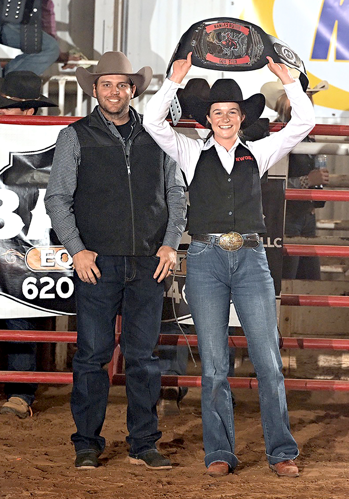 Payton Dingman hoists her goat-tying title belt alongside Northwestern Oklahoma State University alumnus Perry Dietz after Dingman won the Rangers’ rodeo over the weekend.