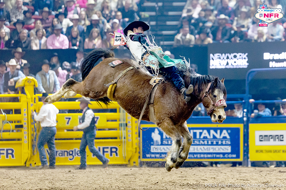 Bradlee Miller got back in the money with an 87.25-point ride on Calgary Stampede’s Blasting Sand to finish in a tie for fifth place in Monday’s Round 5 at the National Finals Rodeo. (PRCA PHOTO BY KATHRYN COLEMAN) LAS VEGAS – Perseverance pays dividends in the end. It’s been a much rougher start to the National Finals Rodeo than bareback rider Bradlee Miller experienced a year ago. By the fifth round of the 2024 championship, he had aligned his pockets with more than $118,000 in Las Vegas cash. He earned just his second payday of this year’s finale with an 87.25-point ride on Calgary Stampede’s Blasting Sand to finish in a tie for fifth place. That was worth $7,688 and pushed his NFR earnings to $27,151. He’s still fifth in the world standings with $234,625 and has five more chances to cash in at the biggest rodeo in the world, which features a $13.5 million purse. The opportunities are out there, and he will take his shot at them. Miller earned his position in this exclusive field with a strong campaign, and he’s among the best cowboys in the game. Expectations, though, are sometimes difficult to achieve given the stature of ProRodeo’s grand finale. Only the top 15 on the money list at the conclusion of the regular season advance to Las Vegas, to the competition is tough. In addition, bareback riders test their mettle and their skills while trying to spur 105 of the best bucking horses in rodeo. The men in the field selected them to be in the City of Entertainment. Blasting Sand certainly fits in that category. The Canadian bronc was part of big-marked rides all season, and Miller’s dance across the Thomas & Mack Center dirt was just another on the animal’s resume. At just 22, Miller’s body of work is just as stout. He finished last year’s NFR with $234,038 earned in over just 10 days of riding bareback horses. Things haven’t come together just yet for the Huntsville, Texas, cowboy, but the finale is at its midway point. Miller will kick off his second half by being matched with Irish Eyes of Sankey Pro Rodeo & Phenom Genetics for Tuesday’s sixth round. The big, powerful bay guided Cole Franks to an 88-point ride in July at Sheridan, Wyoming, and Kade Sonnier matched that score a couple weeks later in Cheyenne, Wyoming. That’s the kind of horse that can help Miller extend on the momentum he gained Monday night.