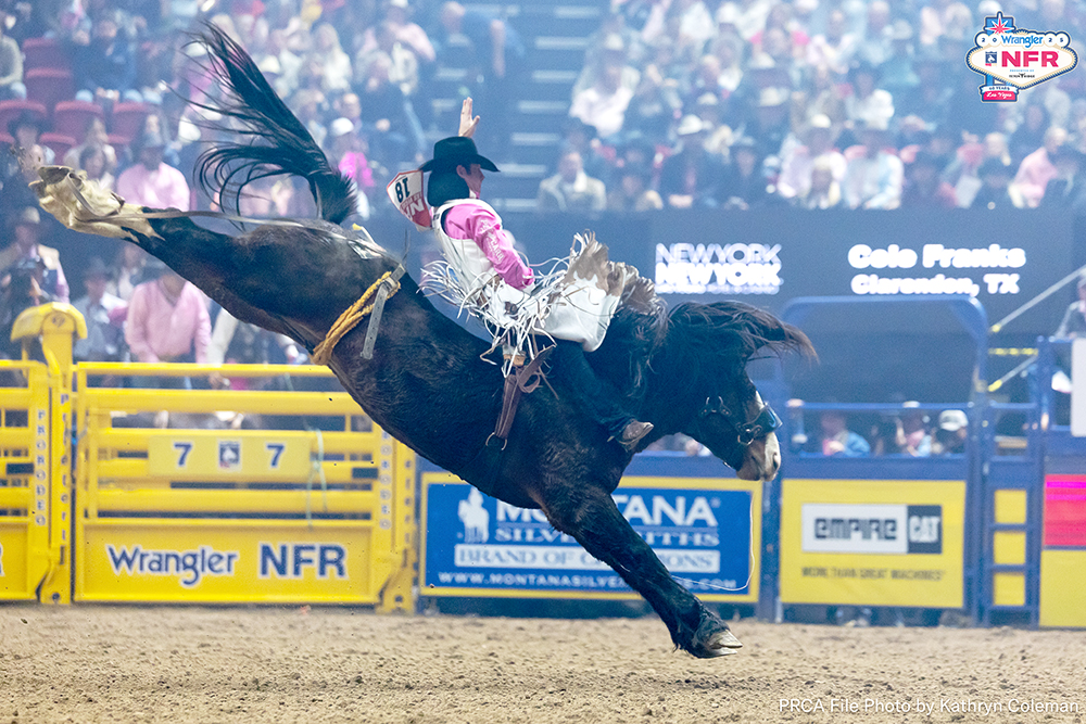 Cole Franks rides J-Bar-J’s Fringe Jacket for 87.25 points to finish in a tie for fifth place during Monday’s fifth round of the National Finals Rodeo. (PRCA PHOTO BY KATHRYN COLEMAN) LAS VEGAS – Six years ago, Cole Franks was 18 years old with an eye for bucking horses. Fringe Jacket was 3 and had already drawn praise as one of the rising stars of bucking horses. He comes great genetics. His sire is Lunatic Fringe, which has produced many top bucking offspring. One of the most legendary stallions is Night Jacket, which sired Big Valley, Fringe Jacket’s mom. J-Bar-J’s Fringe Jacket is now 9 years old and is recognized as one of the top bucking horses in the business. “Guy French raised him,” Franks said of the Texas man, whose son rides bareback horses in the PRCA. “I’ve seen that horse when it was a colt they bucked under a dummy. Keenan Hayes (the 2023 world champion) got on it twice one week at the Junior NFR in like 2019, and I saw it then. Every time I’ve seen that horse, I wanted to get on that horse.” He got his chance and made it work. He rode the athletic bay for 87.25 points to finish in a tie for sixth place during Monday’s fifth round of bareback riding at the National Finals Rodeo. That was worth $7,688 and added a little more to Franks’ pocketbook. He has cleared $19,660 in five nights, but half that came with the $10,000 bonus all contestants receive when they qualify for ProRodeo’s premier event. It was also the second straight night in which Franks has placed after being shut out of the pay window after the opening three rounds. “That round money is not bad,” said Franks, 24, of Clarendon, Texas. “Compared to the first three days, it’s good. Something’s better than nothing. My confidence is where it needs to be. I’m doing my job.” When the business is riding bucking horses, it’s good to be in Las Vegas. There are a lot of rodeos in which Franks competes that a $7,700 paycheck would mean winning the rodeo; at the NFR, it’s because he finished just above the pay line. This is the place he wants to be in December, and he’s missed the finale just once since he was the 2021 Rookie of the Year. That came in 2023, when he finished 17th. He’s never seen a season where he wasn’t in the top 20, and he’s finished among the top 6 in each of his four appearances to the NFR. “I’m a little worried, but that’s because at this point of the NFR, I’m used to having a lot more won, and I’m sitting a lot better,” said Franks, who is seventh in the world standings with $220,022. “At the same time, I came in a lot higher this year than I ever have. I’m sitting about the exact spot I always have about this time, but I just haven’t made much money yet this week.” The 10-round marathon has reached its halfway point. In five days, world champions will be crowned, and over that stretch, go-round winners will collect nearly $37,000 a night. The opportunities are there for the taking. “It’s a restart (Tuesday),” he said. “I’m looking at it as two five-round rodeos. This rodeo is over, and tomorrow is a new rodeo.”