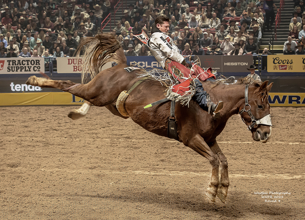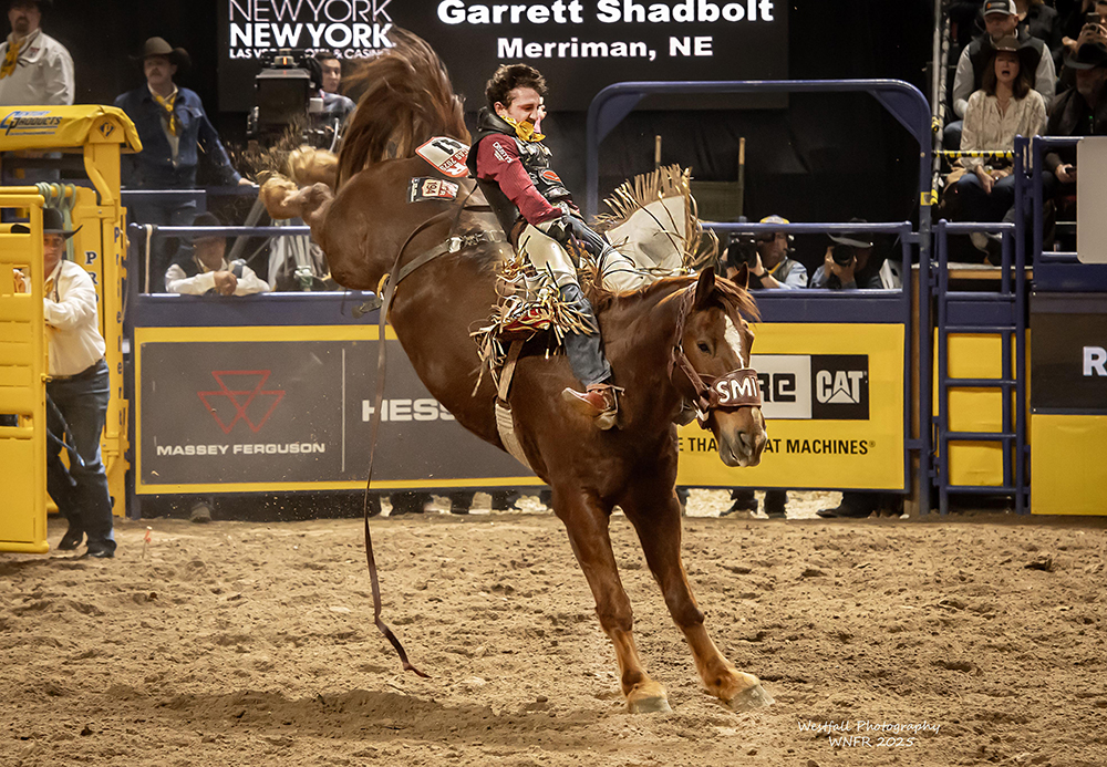 Garrett Shadbolt rides Smith Pro Rodeos’ Mr. Harry for 85.5 points to place during Saturday’s third round of the National Finals Rodeo. After being offered a reride on his first attempt, the Nebraska cowboy had to tussle with two horses in the “eliminator pen.” (PHOTO BY GREG WESTFALL) LAS VEGAS – The “eliminator pen” of bareback horses at the National Finals Rodeo have an intimidating factor about them. They’re the scariest broncs in rodeo, and the men who ride them virtually lock themselves onto muscular flesh of equine dynamite. They have riggings that are strapped tightly to the bronc, then the gloves have binds on the outside of the pointer finger and pinky to secure their hands into the leather-and-rawhide handle. The power from the animal athlete is incredible. Just thinking about it can give a cowboy trepidation, but riding bucking horses is what they do. It may be silent in the locker room before the two nights of mayhem, because all focus is on the battle that is about to ensue. Over his four qualifications to the NFR, Garrett Shadbolt has had his share of tussles with the most-difficult-to-ride, so he knew what to expect. He gritted his teeth, climbed aboard Powder River Rodeo’s Juice Box and nodded his head. His back banged into the buckskin’s rump as the animal bucked, and Shadbolt’s right harm lunged forward. Torque pressed on his hand, elbow, shoulder and spine. It can be brutal; it looks brutal. Alas, Juice Box didn’t have the day needed. The judges noticed that and offered Shadbolt a reride, a chance to get on another horse for an opportunity to cash in during Saturday’s third round. It was a two-for-one special for Shadbolt, a 29-year-old bronc buster from Merriman, Nebraska. Maybe it was a two-for-one beating, but he made it work, spurring Smith Pro Rodeos’ Mr. Harry for 85.5 points to finish sixth in the round, worth $5,914. The big, powerful sorrel gelding provided the stuff Shadbolt needed to reach the pay window for the second straight night. He has increased his NFR earnings to $35,544 and sits eighth in the world standings with $202,805. Riding bareback horses can be difficult on the easiest of horses. The pressure provided by the circumstances – the rigging, the glove and the muscle-bound athlete underneath – sends jolts through a man’s body. Getting on two broncs a day will leave a cowboy spent. It’s just magnified greatly when that animal is of the stature reflected by Juice Box and Mr. Harry. Shadbolt was spent by the time Saturday’s performance came to a close. He’d earned every dollar he collected, and then some. He earned a few hours of rest and recovery, but it doesn’t last long in Las Vegas. He’s got seven more broncs to ride before his 2025 season comes to a close.