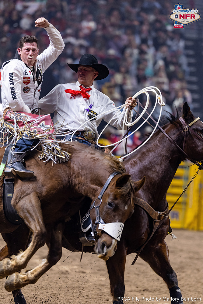 With veteran Matt Reeves hazing on trusty Kirk, left, J.D. Struxness placed again with a 4.0-second run during Monday’s fifth round of the National Finals Rodeo. (PRCA PHOTO BY KATHRYN COLEMAN) LAS VEGAS – The National Finals Rodeo arena inside the Thomas & Mack Center is tiny. It’s dimensions pale to most complexes. Think basketball court or hockey rink, then add dirt. Timed-event cowboys know they need to be fast if they want to make money at ProRodeo’s premier championship. Steer wrestler J.D. Struxness is now in Las Vegas for the seventh time in his career. The 31-year-old is a veteran, not only of the game but of playing on the sport’s biggest stage. A year ago, he took advantage of that and battled his way to a world championship. He’s well on his way again. Struxness stopped the clock in 4.0 seconds to finish fourth in Monday’s fifth round, cashing in to the tune of $15,377. Over the first half of the 10-day championship, he has a cumulative time of 30.5 seconds – with a third of that coming from a 10-second penalty in Round 4 for not allowing the steer an appropriate head start – and still sits third in the average race. “We made a change to Kirk on the hazing side,” he said of the sorrel gelding, owned by Savannah Reeves and ridden by her husband, veteran hazer Matt Reeves. “My horse, Jenny, was getting a little sore, and with it being her first time here, we didn’t want to ruin her confidence for this building, because she has a lot of years left. “He’s only 6. She had a decent experience here, and we didn’t want to let that little injury affect her. So, we switched over to Kirk, the old trusty. We had a plan to have old trusty here in case we needed him.” Kirk will likely get the call the rest of the week. Struxness has earned $62,833 in five nights, and half the rodeo remains. He is just a half-second behind second place in the aggregate, and there’s momentum on which to build. “(Sunday) night was just a little mishap,” he said. “We didn’t do anything wrong; we just got unlucky. We were right on the barrier and just on the wrong side of great. (On Monday), we blew the barrier out and were able to place again. We left just a little bit cleaner, and that was the difference between great and a broken barrier.” Jenny isn’t the only young horse in the mix at Las Vegas. Struxness’ bulldogging mount, Ice, is 7, but the athletic gray gelding has been on top of his game. “It’s fun, because it’s getting pretty easy to get that start on him now, and he has his confidence up. He’s really running through there now, so we’re looking forward to the next five rounds.” A key ingredient is taking care of the animals. All athletes need to be in top form to compete at a championship event, and that includes the equines. “We feed him Unbeetable Feeds, which is a great company based out of Minnesota,” said Struxness of Milan, Minnesota. “It’s been an awesome partnership for me, and we’ve been really happy with their feeds. They are doing things left and right to keep up their game and upgrading their feeds, putting science behind it and getting it out there. They’re getting to see real results now.” So is Struxness, who has increased his season earnings to $201,505; he is fifth in the world standings. With go-rounds paying nearly $37,000, he has plenty of opportunity left to cash in big. Placing in the aggregate would be nice, too. If he remains third, he will add another $60,000 to his coffers Saturday night; If he moves up a spot, it’s a $16,000 increase. “When you get here, we all play to just knock it out of the park, but it’s not a disappointing NFR by no means,” he said. I think we’ve got everybody’s confidence built now, and we’re going to go ahead and let it rip the second five rounds.”