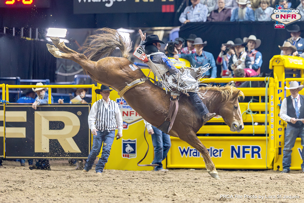 Bareback rider Kade Sonnier picked up his first National Finals Rodeo go-round win, scoring 88 points on Land Of Fancy from Sankey Pro Rodeo & Phenom Genetics to do it during Tuesday’s sixth round. (PHOTO BY CASEY ST BLANC) LAS VEGAS – It’s taken 16 nights of bucking horses at the National Finals Rodeo, but bareback rider Kade Sonnier finally cleaned off an item on his bucket list. “It took (16) rounds for me to get it done, and I thought I’ve had a lot of really good chances to do that in my first 15 rounds of the NFR,” said Sonnier, who rode Land of Fancy from Sankey Pro Rodeo for 88 points to win Tuesday’s sixth round. “Sometimes I might have cost myself, or sometimes the horses just didn’t have their day. “To be here in Round No. 6, it’s pretty special. We’re just halfway through this deal.” He qualified for ProRodeo’s grand championship in 2023 and finished third in the world standings that season, placing seven of 10 times, but he never picked up a round victory. So far this year, he’s ridden six horses for a cumulative score of 510.75 points and sits fourth in the average race. He’s also earned $96,150 in Las Vegas. “There’s a lot of money left to be won, and it’s a really good time to get hot riding bareback horses at the National Finals,” said Sonnier, 26, of Carencro, Louisiana. “I knew that I had a lot of ground to make up. Coming in, the No. 1 goal is to win the NFR average and just let the cards fall where they lay. “When it comes to winning a world title, I knew I had a lot of ground to make up there, too, but if we keep the glory to God for good draws and keep our chin down and keep spurring hard, you just do that. The reality is, we’re going to control the controllables, and the main thing of that is just having fun.” He is. He is fourth in the world standings with $267,657. He’s $154,000 behind the standings leader, Texan Rocker Steiner, but four round wins will put him within range. Winning the average title will pay an additional $94,000 bonus Saturday night. Sonnier has placed in four rounds so far, including the last three. The momentum is on his side, and he spurred Land Of Fancy like a man on a mission. His traveling partner, Kansan Jess Pope, finished third on the horse during last Thursday’s opening round. “That horse belongs to Wade Sankey, and I ran into Wade (Monday) night,” he said, pointing out that he finished second on Sankey’s Shoutin’ Shoes in Round 4. “I told him, ‘We’re going to do it tonight.’ I thought we were going to do it the other night and had a really good chance. “I had a chance to get on her before. I was 87 in Filer, Idaho, and I knew what that horse felt like then, and I knew coming into it tonight that I had a really good chance. She bails in the air and hangs and kicks hard, and she gives you all the timing in the world to be able to show off your deal. I’m just grateful she did her job to the best of her ability so I could do mine.” The fire has been lit, and the embers are burning. Four nights remain on Sonnier’s season, and he knows the task in front of him if he wants to walk away from the City of Entertainment with a Montana Silversmiths gold buckle.