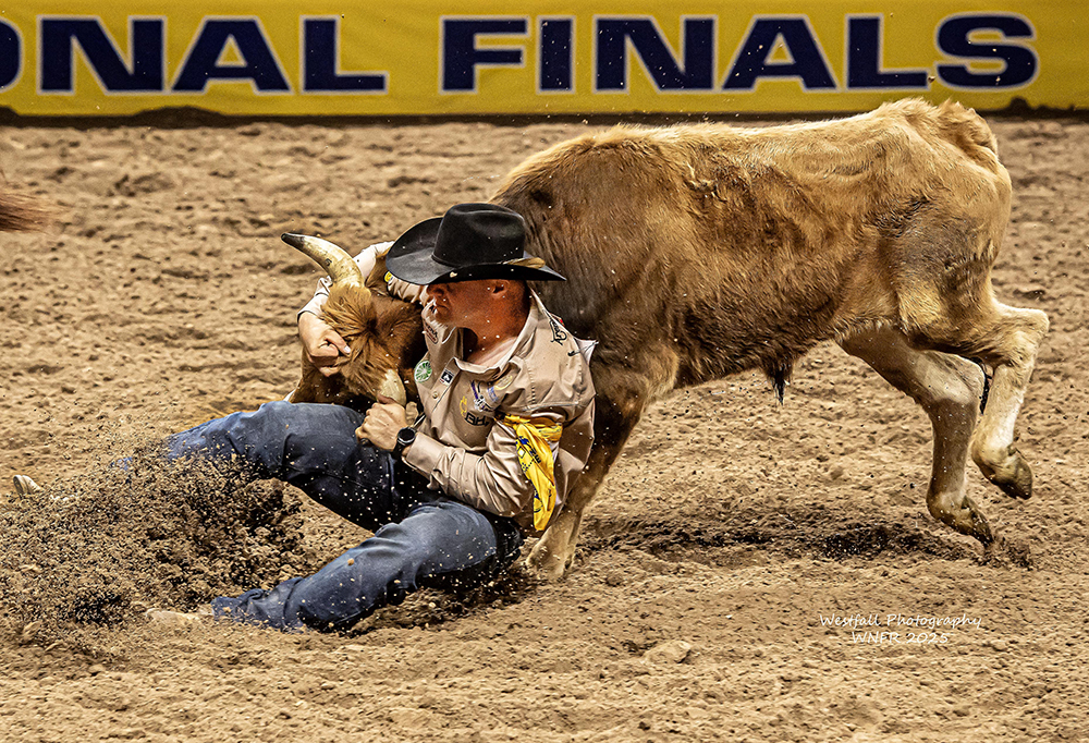 California bulldogger Tucker Allen mustered some extra umpth in order to power through a 4.2-second run to finish second during Wednesday’s seventh round of the National Finals Rodeo. (PHOTO BY GREG WESTFALL) LAS VEGAS – It’s been that kind of a week for steer wrestler Tucker Allen. He didn’t make the kind of run he wanted to Wednesday night, but he finished in 4.2 seconds to finish as the runner-up to the seventh-round winner and collect a $28,980 payday at the National Finals Rodeo. “I should have been really, really fast, and I kind of over-rode my horse and just had to snag him up and tip him over,” said Tucker, a two-time NFR qualifier from Ventura, California. “This pen of steers is no day off on any of them.” The animals made the steer wrestlers work for it. There are three sets of steers on which the bulldoggers compete. The winning time in Tuesday’s sixth round was 3.5; Rowdy Parrott was 4.0 to win Wednesday. This was the third time this particular group of cows was in the lineup, and the bunch will be run again during Saturday’s 10th round. “I don’t mind a pen of steers like this where you’ve got to go bulldog,” Allen said, noting the extra effort it takes to wrestle the steers to the ground. “It’s damn sure a bulldogging contest, and the times show. “I’m just happy to get a decent check. I could’ve gotten an even better start. I feel like I got a good roll off the corner, but I didn’t blow (the barrier) out.” The start is vital. The barrier is a roped line in front of the timed-event box that releases when the steer is provided an adequate head start. It’s best to be right on that line when it springs free. Possibly the biggest advantage is that he’s riding Banker, the 2025 Steer Wrestling Horse of the Year owned by fellow bulldogger Justin Shaffer. “That shows us the horsepower that even though I was a little off the barrier, Banker still caught up good,” he said. Allen has grappled seven steers to the ground in a cumulative time of 32.7 seconds and leads the aggregate race. He has pocketed $111,428 so far. He is also second in the world standings with $262,796, about $29,000 behind the leader, Mississippian Will Lummus. It’s going to be a race for the world championship over the final three nights of the 2025 ProRodeo season, and Allen is right in the thick of it all. “I’m not keeping track of anything,” Allen said. “I’m just going one at a time and going to have fun. That’s all there is.” That Montana Silversmiths gold buckle might be a nice addition to the party.