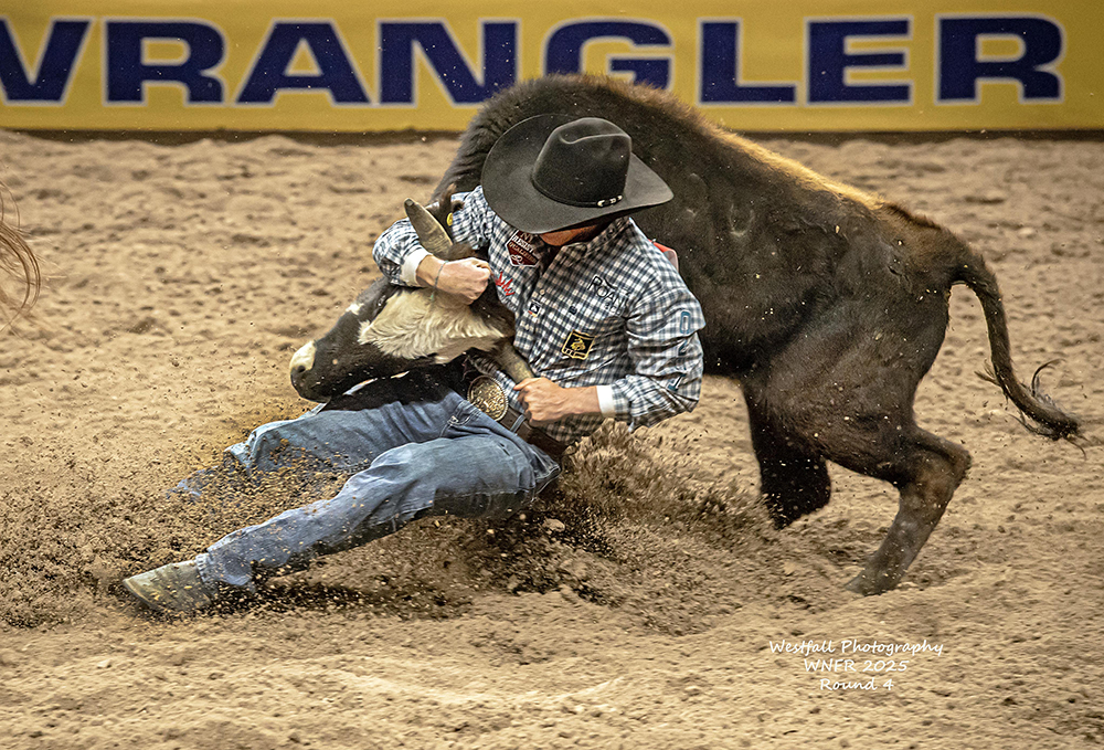 Steer wrestler Tucker Allen scored his second round victory of the 2025 National Finals Rodeo, blasting a 4.0-second run to share the fourth-round title with Will Lummus. (PHOTO BY GREG WESTFALL) LAS VEGAS – Tucker Allen may need the write-off anyway. After his pickup was stolen from a parking lot near the Thomas & Mack Center, Allen has been hitching rides to work, which happens to be occurring in the arena for the National Finals Rodeo. Other than his ride situation and the police report, the job has been going well. He’s been taking care of business, and the proof came again with a 4.0-second run to share the Round 4 steer wrestling victory with Mississippian Will Lummas. That was worth $32,824 to each cowboy, and it could make for a nice downpayment on a replacement vehicle. “I can pay for Ubers now,” a smiling Allen said, nodding toward the $82,449 he’s earned in four Las Vegas nights. “I still have to buy a new truck.” Most of his earnings came on the second and fourth nights, those when he took at least a share of top honors; he also snagged a smaller payday for finishing in a tie for sixth place in Round 3. “While I was trying to get out of the barrier really good (timing the start), I was still a little late,” said Allen, 26, of Ventura, California. “It shows how good Banker is, even though I was off the barrier and still split the round.” The barrier line is stretched across the steer wrestler to allow for the steer to have a head start. Should the contestant not allow for that, the barrier will break, and the cowboy will be saddled with a 10-second penalty. “That just shows Banker’s horsepower,” he said. “That steer was really good on the ground, but I knew I had to get my feet down in a good spot. It could have been a little better, but it could have been a lot worse. It worked out.” There are layers to the NFR. There are 10 go-rounds with payouts to the top six places each night. There’s also the average race, which provides a healthy bonus to the top eight finishers when the rodeo concludes. Round winners earn $36,668 in every event; the average champion will pocket a $94,036 next Saturday. Allen has wrestled four steers to the ground in 17.9 seconds and is second in the aggregate race. He’s moved from fifth to second in the world standings with $233,316 and trails Lummus, the leader, by $23,000. With six rounds remaining, it’s too early to even consider the average placing, but should he hold his place, there would be a $76,000 bonus. “I’m treating every round like a one-header,” Allen said. “I’m forgetting about what happened behind me, and I’m not worried about the average ahead of me. I’d rather lose the world by breaking a barrier than backing off and not winning it. “I’m willing to take that risk.” Allen finished fourth in the average a year ago and said nobody even remembers it. They’ll remember two go-round victories from his second appearance in Las Vegas. “Hopefully we can win a few more,” he said.