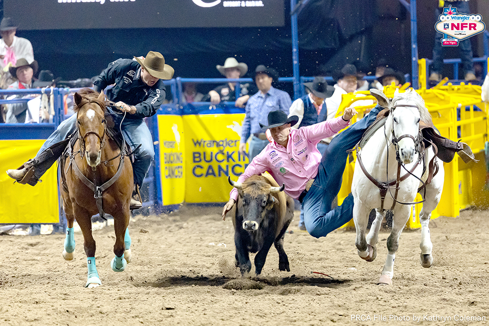 Bridger Anderson scored a 4.3-second run to finish in a tie for third place during Wednesday’s seventh round of the National Finals Rodeo. (PRCA PHOTO BY KATHRYN COLEMAN) LAS VEGAS – When half the equation in rodeo involves livestock, there’s never a guaranteed outcome. The steer wrestlers found that out during Wednesday’s seventh round of the National Finals Rodeo. The steers were big and strong, and times reflected it. Bridger Anderson knew he had a powerful steer, but he handled business during a 4.3-second run to finish tied for third, worth $18,630. “That steer really tried, but I knew it was going to be good on the ground,” said Anderson, a three-time NFR qualifier from Carrington, North Dakota. “I got a pretty good start and rode up in there to him. That was probably the best run I made all week.” Confidence is brewing in the 27-year-old cowboy, the 2019 intercollegiate bulldogging champion while competing at Northwestern Oklahoma State University. “We had to run that steer down there a little ways, but it worked out,” said Anderson, who busted into a tie for first after his run, then watched two of the last three cowboys surpass him; Rowdy Parrott won the round in 4.0 seconds, and Tucker Allen was second with a 4.2. “Tuck came back and bumped me, then Rowdy made a stud run right there. “It just teases you there after a while. You keep watching, and you’re thinking, ‘Gosh, 4.3 shouldn’t win first, but we’re running out of guys to beat it.’ It was pretty excited. Hopefully in the next couple of nights, we draw one of them slower steers and might find ourselves making at trip to the South Point.” The casino and resort eight miles south of the Thomas & Mack Center on Las Vegas Boulevard hosts the nightly go-round awards, and winners will add a Montana Silversmiths buckle and other trinkets to their prizes during an hour-long stage show. Anderson has earned $74,169 over seven nights in Las Vegas. He is 10th in the world standings with $183,496, but he has been saddled with two no-times. With three pens of cattle set for the 10 rounds, all the steers have been seen. Wednesday’s performance marked the third time for that grouping of animals to be in the mix. That means the bulldoggers know what to expect. Like other athletes, they do their homework, study video and try to see trends. They also pay attention to what others may have done, and it’s how they build confidence in themselves and their performance. “J.D. (Struxness) made a good run on that steer in the first performance,” Anderson said. “Justin Shaffer ran him in the fourth performance, and (the steer) was just a touch off to the right. We knew he was going to run, but (the bulldoggers) have thrown him a bunch, and we knew he was just going to be an honest steer and good on the ground. “All I had to do was make sure I hit the start and make a good run.” That’s the game plan for the final three nights of the 2025 ProRodeo season.