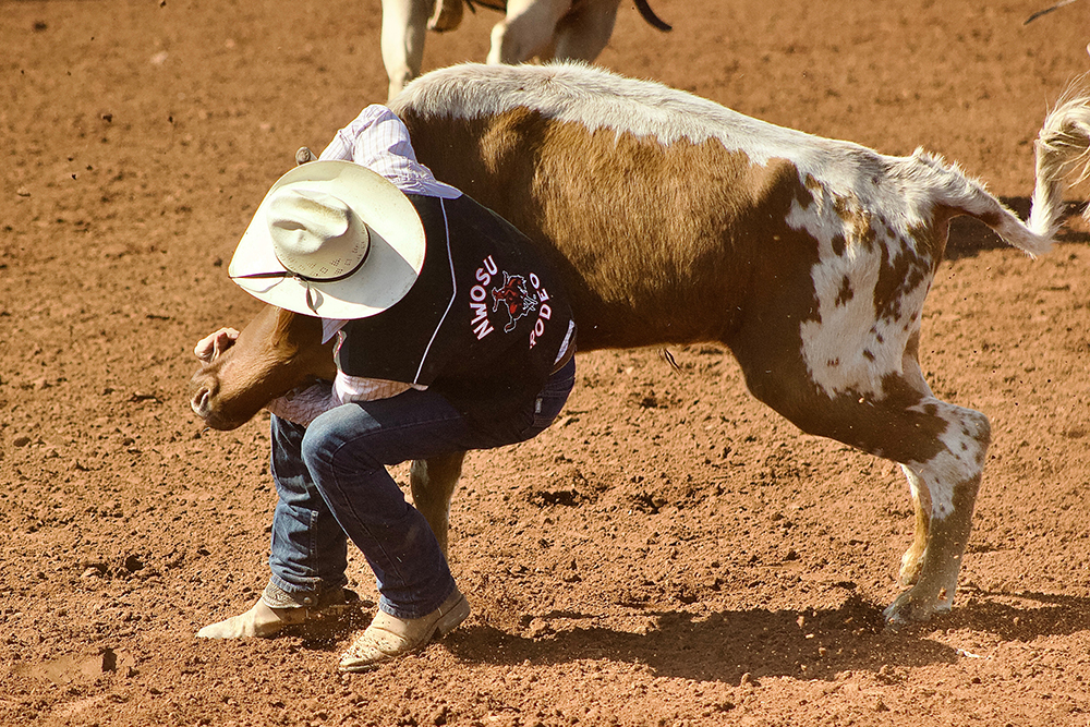 Northwestern Oklahoma State University steer wrestler Nathan Duvall went from worst to first during Sunday’s championship round at the Fort Scott (Kansas) Community College rodeo. Duvall, shown in this image from last fall in Stillwater, Oklahoma, was atop the race but was followed by teammates Tydon Tsosie and Emmett Edler. (PHOTO BY EMILY VILLEIUX) ALVA, Okla. – On paper, Nathan Duvall didn’t think he had much of a chance. It might be a good thing his skin is thicker than that. He stopped the clock in 3.8 seconds during Sunday’s championship round of the Fort Scott Community College rodeo to not only win the day but also the steer wrestling title in southeast Kansas. “I thought I was out of it, so I took a start,” said Duvall, a junior at Northwestern Oklahoma State University from Henryetta, Oklahoma. “I drew a steer that they hadn’t done any good on him. I watched video, and he looked like he had a lot of action.” It all went back to the beginning. Steers – and all timed-event cattle – are given a head start. Contestants must begin behind a barrier line that is only tripped when the animal has the correct advantage. If a cowboy or cowgirl leaves too early, the barrier will break resulting in a 10-second penalty. Timing it perfectly means the chest of the horse hits the barrier at the same time it releases. That’s where Duvall was Sunday afternoon. “I was pretty into it,” he said with a laugh. “That steer did have a lot of action.” The combination made for the fastest time of the rodeo. It made up some serious time. Of the 12 bulldoggers in the short go-round, Duvall’s 6.0-second run in the first round was the slowest. By making such a quick second run, he blew past all the others into the top spot. Right behind him, though, were sophomore Tydon Tsosie of Crownpoint, New Mexico, and graduate student Emmett Edler of State Center, Iowa. Tsosie was the runner-up in the opener with a 4.7 and finished third in the final round to place second overall, while Edler’s 4.7-second run in the short run helped him to second in the round and third in the aggregate. “All of us bulldoggers showed out,” Duvall said, pointing out that 16 Northwestern contestants made up 17 positions in the championship round. Proof was in the field. Half the steer wrestlers in the short round were Rangers. Grady Aasby of Highmore, South Dakota, and Sam Daly of Tryon, Nebraska, placed in the first go-round but failed to record times on their second steers. Hazen Sparks of Talihina, Oklahoma, was also in the final round. “We were there to take their money,” Duvall said. “We’ve been having really good practices, and everybody’s been showing up and lifting each other up. That helps out a lot.” Sparks gathered points by winning the first round of tie-down roping. Carter Anderson of Merriman, Nebraska, was fifth in the first round and sixth overall. Team roping heelers Sage Bader of Kim, Colorado, and Colter Snook of Ford, Kansas, placed in the opener. Bader, who roped with Mattox Moyer of Oklahoma State University, won the first round after posting a 6.0-second run. Snook finished sixth with a 7.8-second run roping with Dexton Hoelting of Western Oklahoma State College. Saddle bronc rider Riley Smith of Poteau, Oklahoma, also made the final round for the Rangers. Northwestern was fourth in the men’s team race, while the women’s team finished third overall. Breakaway roper Kinlyn Yadon of Otterkein, Indiana, led the way for the Rangers women; she won the short round with a 2.4-second run and moved up to second in the aggregate. Bleu Hall of Okmulgee, Oklahoma, finished fourth in both rounds and the average. Sarah Pita of Middle Grove, New York, and Y’Leigh Yarbrough of Cheyenne, Oklahoma, joined their teammates in Sunday’s round. Goat-tier Payton Dingman padded her lead in the Central Plains Region standings. Dingman, a sophomore from Pryor, Oklahoma, placed fourth in both go-rounds and finished third overall. Tyra Tsosie of Crownpoint capitalized on two solid runs to finish sixth in both the short round and the aggregate. Like Dingman, Duvall increased his lead in the standings. He entered the competition in Fort Scott as the top dog, then added 120 points to his resume. He has accumulated 610 points and holds a 245-point lead over Edler, the No. 2 man, with four events remaining on the schedule. With each opportunity, Duvall will continue to lean on his primary partner, Turnpike, an 11-year-old palomino gelding that he acquired from his cousin, four-time National Finals Rodeo qualifier Riley Duvall. “I took him to his first rodeo,” Nathan Duvall said. “He taught me a lot from teaching him. We’ve just been made for each other.” The Rangers return to action the final weekend of March, then will have four rodeos in five weeks. A season ago, Duvall placed in the final four rodeos while competing at Connors State College in Warner, Oklahoma, and earned his spot at the College National Finals Rodeo. “My goal is to win the region,” he said. “That’s the reason I came back to college. Last year, I ended up fourth (at the college finals,), so I want to do better than I did last year.” Striving for excellence is a winning formula.