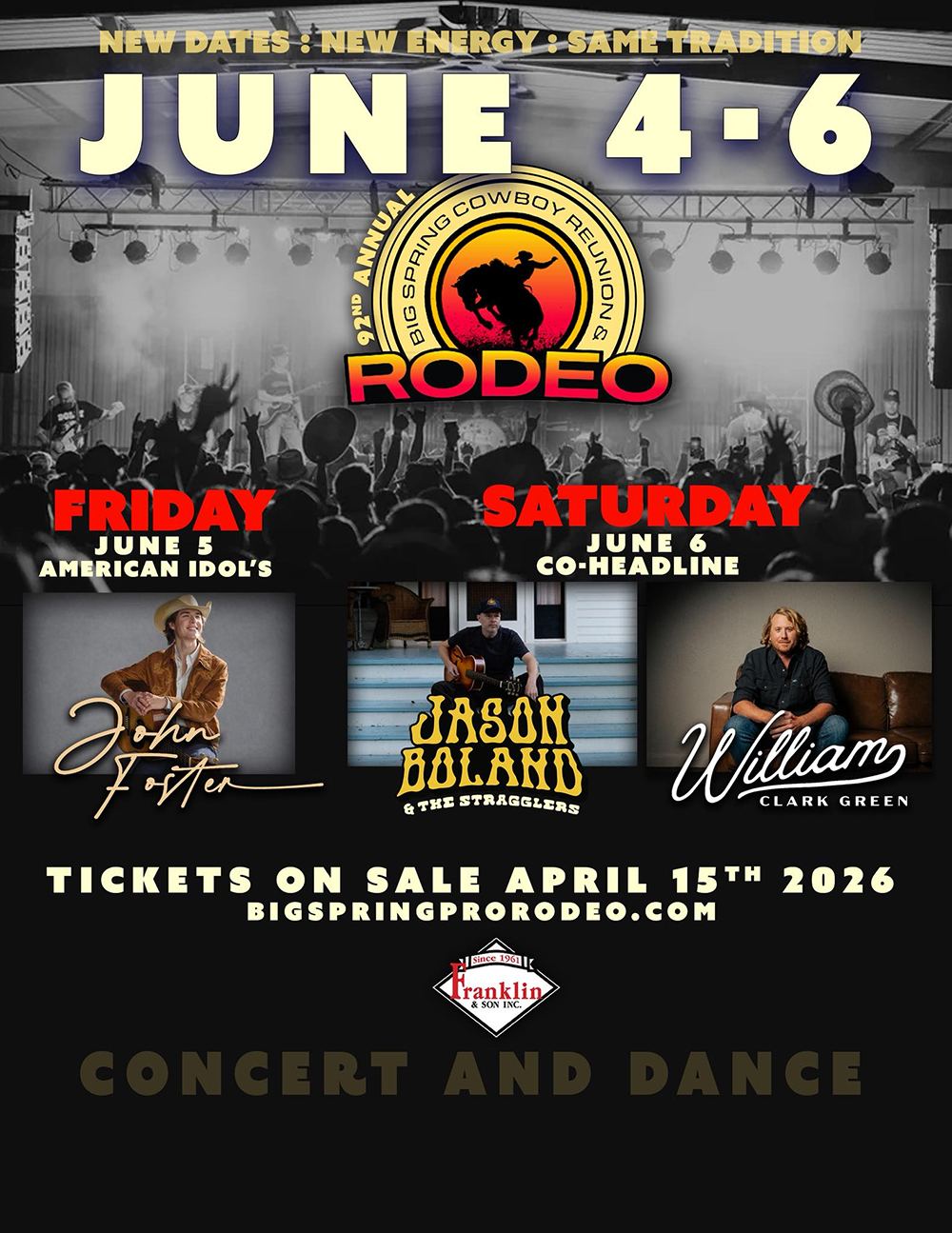 “Our concerts this year are the perfect match with our rodeo changing its dates to the first weekend in June,” said Cash Berry, chairman of the volunteer rodeo committee that produces the annual event. “I know our Saturday night is going to be exceptional. Jason Boland and William Clark Green have a huge following, but to also get John Foster is a big deal for our community.”