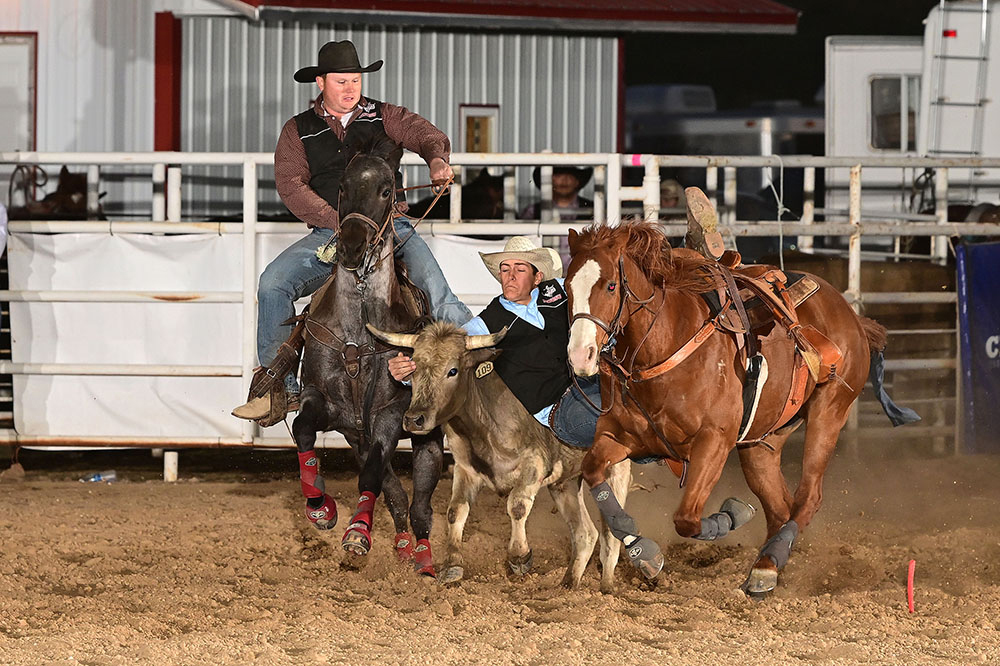 Shank Stephens, riding for Oklahoma Panhandle State University several years ago, competes at Hitch Arena during the Doc Gardner Memorial Rodeo, which takes place Thursday-Saturday in Guymon. (PHOTO BY DALE HIRSCHMAN) GUYMON, Okla. – When Dusty Moore and Paul Peterson return to town, they’ll have a lot going on. They are two of the three pickup men who will work the annual Guymon Pioneer Days Rodeo, set for 7:30 p.m. Friday, May 1; 2 and 7:30 p.m. Saturday, May 2; and 2 p.m. Sunday, May 3, at Henry C. Hitch Pioneer Arena. They’re also alumni of the Oklahoma Panhandle State University rodeo team. “It’s pretty cool that we have two of our alumni here for the ProRodeo,” said Shelbie Rose, Panhandle State’s rodeo coach. “The same kind of thing happens at our college rodeo. If the kids want to pick up during the year at practice, they usually get to pick up at the college rodeo, too.” Pickup men are typically some of the most versatile cowboys. They know how to read livestock, and they’re horsemanship and roping skills are valuable. They can be called on to rescue another cowboy out of a wreck or handle any of the many other duties that come their way. For decades, the Panhandle State rodeo team has been training great cowboys and cowgirls. The program boasts of seven national team titles and 22 individual champions. The program will host its annual event – the Doc Gardner Memorial Rodeo – from Thursday-Saturday at Hitch Arena. “The community we have is very vital,” Rose said. “Without it, there would be no Panhandle State rodeo team. It’s not just Goodwell, and it’s not just Guymon. It’s not even just Texas County. Our community is pretty broad, probably the whole Panhandle of Oklahoma and some of Texas, and it reaches a lot further than that.” The Panhandle State program and the Pioneer Days Rodeo volunteer committee have come to realize not only the community support but also the benefit they have in collaborating with one another. “I think the two go hand-in-hand,” said Ken Stonecipher, the committee’s chairman. “We can’t do this without them, and that’s not an exaggeration. They come during slack, sort cattle, load cattle, untie calves. The committee has some folks there, too, but without them, we’re not getting that all done.” The two entities share more than the arena. They share a passion for the sport, and they work closely together to ensure greatness happens for two weeks every spring. This first week belongs to the roughly 500 intercollegiate cowboys and cowgirls, and next week is the return of favor for when more than 1,000 ProRodeo contestants. “The Guymon ProRodeo committee has been absolutely great to us,” Rose said. “It’s a blessing to have our rodeo right before theirs. It allows us to share equipment and bulldogging cattle. They’ve helped us with roping chutes over the past several years. They always show up to our fundraisers. They buy ads to support our rodeo. “They’re a very big part of what we do.” The same can be said of the rodeo program’s work with the PRCA event. Competition for the ProRodeo begins two days after the championship round of the college rodeo and lasts for seven days. Panhandle State contestants and coaches are on hand through the duration. “I’ve known Shelbie since she was a student on the Panhandle State team, and she has an unmatched work ethic,” Stonecipher said. “You cannot outwork her. From the practice pen to fundraising to building new barns for the kids’ horses, she’s out there. “When student athletes come to college, they all don’t have the same amount of natural talent, but the thing that overcomes that difference in talent is hard work. Shelbie is a great person to lead that effort.” Pioneer Days Rodeo will certainly have a Panhandle State flair. Whether it’s the pickup men or student helpers or alumni riding broncs, the university’s reflection is seen throughout the seven-day rodeo. With 10 days of competition at Hitch Arena between the two events, Guymon becomes Rodeo Town. “Rodeo is a way of life out here,” Rose said. “Most of the people around here are tied to agriculture in some way, so rodeo is naturally a favorite sport. At the college, the rodeo program, by far, has had the most success. It’s a great place to have a rodeo program, because we have a lot of support. “It’s a staple around here, and people that aren’t from an ag background have really grown to love it because it’s one of the best things that happens around here.”