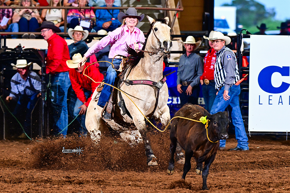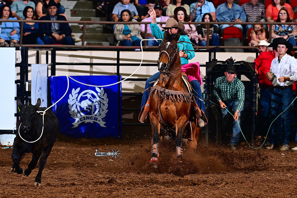 Tibba Smith ropes her calf in 2.1 seconds to share the second-round lead at the San Angelo Stock Show and Rodeo. She’s also second in the two-run aggregate and has almost clinched her spot in the April 17 championship round. (PHOTO BY JENNINGS RODEO PHOTOGRAPHY) SAN ANGELO, Texas – When she’s not working as an insurance adjuster or handling secretarial duties at a Lone Star Region intercollegiate rodeo or representing others as the breakaway roping director for WPRA’s Western Region, Tibba Smith is probably riding and roping. “Yeah, I stay real busy,” said Smith of Hobbs, New Mexico. No matter where work takes her, she’s still a cowgirl at heart. She has shown that over the past several days at the San Angelo Stock Show and Rodeo. She roped her way into a virtual lock for the championship round on Friday, April 17, with her 2.1-second run during Sunday’s fourth performance. In fact, she was one of two ladies to pull off a 2.1 on a fast track inside CRC Roofers Coliseum, joining Bradi Good of Abilene, Texas. The difference for Smith was her first-round run of 3.0 seconds last week in Spur Arena, moving the New Mexican to second in the aggregate race with a two-run cumulative time of 5.1 seconds – she is one-tenth of a second behind the leader, Amy Ohrt of Victoria, Texas. “I think the key was that I got a really good start,” Smith said. “I really wanted to be about 1.9, but the calf let up just a little bit, so it took extra time for the (string) to break off (the saddle horn). It was still a great run.” Another advantage was her horse, Rocketman. She spent the last couple of seasons preparing the young, bay gelding to compete at a high level. “He’s still a little bit green,” she said. “I picked him out as a 2-year-old running in the pasture. He could move so fast. He’s little-strided, but he’s fast. I bought him from some really good friends in Florida; they called me and told me they were going to sell him. I loped a couple circles, stopped him and wrote a check for him. “We’ve been seasoning him. I went out for about a month last summer and took him. I was jus going to ride him at just some places and get him ready, because I have another horse. Well, he started doing great, so I ended up just riding him most of the summer.” Rocketman’s transition to the game shows. The bay speedster wasn’t the only young athlete to show his stuff Sunday. John Crimber closed out the show with a 90-point ride on New West Rodeo Productions’ Payday to take the bull riding lead. “That bull felt really good,” said Crimber, 20, of Sunset, Texas. “It just drifted into me while sucking back, and I really like bulls that do that. When they come up under you and just buck hard, I fit those bulls really good.” Crimber is a rookie in ProRodeo but is the No. 1 bull rider in the PBR’s premier tour. His father, Paulo, was best known for his talent in the PBR, but he also advanced to the 2004 National Finals Rodeo and won the average championship that December. His son might be following in those footsteps. “I’ve always dreamed of riding in these big rodeos, and this is a cool little rodeo arena,” John Crimber said. “I’ve heard about this rodeo, but I’ve never been here before. It was a really cool experience to be riding in such a great venue like this. “It was really loud and packed. It was a beautiful Easter Sunday for sure.” San Angelo Stock Show and Rodeo April 3-18 Bareback riding leaders: 1. Leighton Berry, 92 points on Korkow Rodeo’s Tator Tot; 2. Cole Reiner, 88.5; 3. (tie) Jayco Roper and Cooper Cooke, 86; 5. Kade Berry, 85.5; 6. (tie) Taylor Broussard and Cole Hollen, 84.5; 8. Cooper Filipek, 84; 9. Keenan Hayes, 83.5; 10. (tie) Toby Deudney and Gauge McBride, 83; 12. (tie) Ethan Mazurenko and Daxtyn Feild, 82. Steer wrestling: Third round leaders: 1. Tory Johnson, 4.4 seconds; 2. Jacob Daniell, 4.6; 3. (tie) Evan Spady and Tristan Martin, 4.7; 5. Tony Aska, 4.8; 6. Gavin Soileau, 5.2; 7. Seth Peterson, 5.3; 8. Chase Crane, 5.1. Average leaders: 1. Chase Crane, 15.3 seconds on three runs; 2. Grant Peterson, 15.7; 3. Tony Aska, 16.4; 4. Ty Allred, 17.5; 5. Tyke Kipp, 21.0; 6. Cody Harmon, 24.2; 7. Evan Spady, 24.3; 8. Emmett Edler, 26.1; 9. Peter Haas, 28.0; 10. Logan Kenline, 28.3; 11. James Mann, 31.0; 12. Tanner Milan, 32.2. Tie-down roping: Third round leaders: 1. Cory Solomon, 8.5 seconds; 2. (tie) Brodey Clemons and Cash Enderli, 8.7; 4. (tie) Trevor Hale and Quade Hiatt, 9.1; 6. (tie) Beau Cooper and Sam Lewis, 9.2; 8. Joel Harris, 9.4. Average leaders: 1. Beau Cooper, 26.2 seconds on three runs; 2. Joel Harris, 27.3; 3. Sam Lewis, 27.5; 4. Brodie Mattson, 27.7; 5. Cole Clemons, 28.2; 6. Cash Enderli and Colton Suther, 28.8; 8. Brodey Clemons, 28.9; 9. Cory Solomon, 29.3; 10. Shane Hanchey, 29.6; 11. Michael Otero, 29.8; 12. 12. Zack Jongbloed, 34.5. Saddle bronc riding leaders: 1. Zeke Thurston, 87.5 points on Pete Carr Pro Rodeo’s Uptuck; 2. (tie) Mitchie Story and Damian Brfennan, 87 points; 4. Lefty Holman, 86; 5. (tie) Kolby Wanchuk and Joe Macqueen, 85.5; 7. Kade Bruno, 85; 8. Ryder Sanford, 84; 9. (tie) Darcy Radel, Wyatt Casper, Kole Ashbacher and Rusty Wright, 83.5. Breakaway roping: Second round leaders: 1. (tie) Hailey Hall, Millie Greenwood, Tibba Smith and Bradi Good, 2.1 seconds; 5. Kinlie Brennise, 2.2; 6. Amy Ohrt, 2.3; 7. Zoie Bedke, 2.7; 8. Karrigan Graves, 2.9; 9. (tie) Josie Goodrich, Rylee George and Jackie Crawford, 3.2; 12. Haiden Thompson, 3.3; 13. Erin Johnson, 3.8; 14. Jimmie Smith, 3.9; 15. Peggy Garman, 11.8. Average leaders: 1. Amy Ohrt, 5.0 seconds on two runs; 2. Tibba Continue Reading »